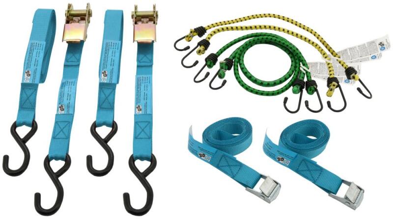 Komplett készlet a rakomány rögzítéséhez szállítás közben. A teljesen fém racsnis mechanizmussal ellátott szorítóhevederek hevederszélessége 25 mm, hossza pedig 5 m. A hevederek végét műanyag felületű fém kampók oldják meg, 250 daN húzóerővel. A fémcsatos szorítóhevederek hevederszélessége 25 mm, hossza 2,5 m, húzóereje 250 daN. A készletben található még két pár színkódolt, 40 és 60 cm hosszú, fém kampós flexibilis bilincs. Termék részletek: